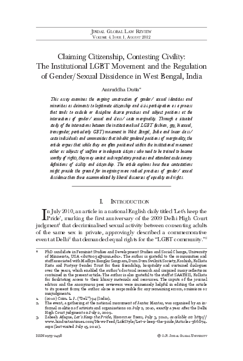 Pdf Claiming Citizenship Contesting Civility The Institutional Lgbt Movement And The Regulation Of Gender Sexual Dissidence In West Bengal India Aniruddha Ani Dutta Academia Edu